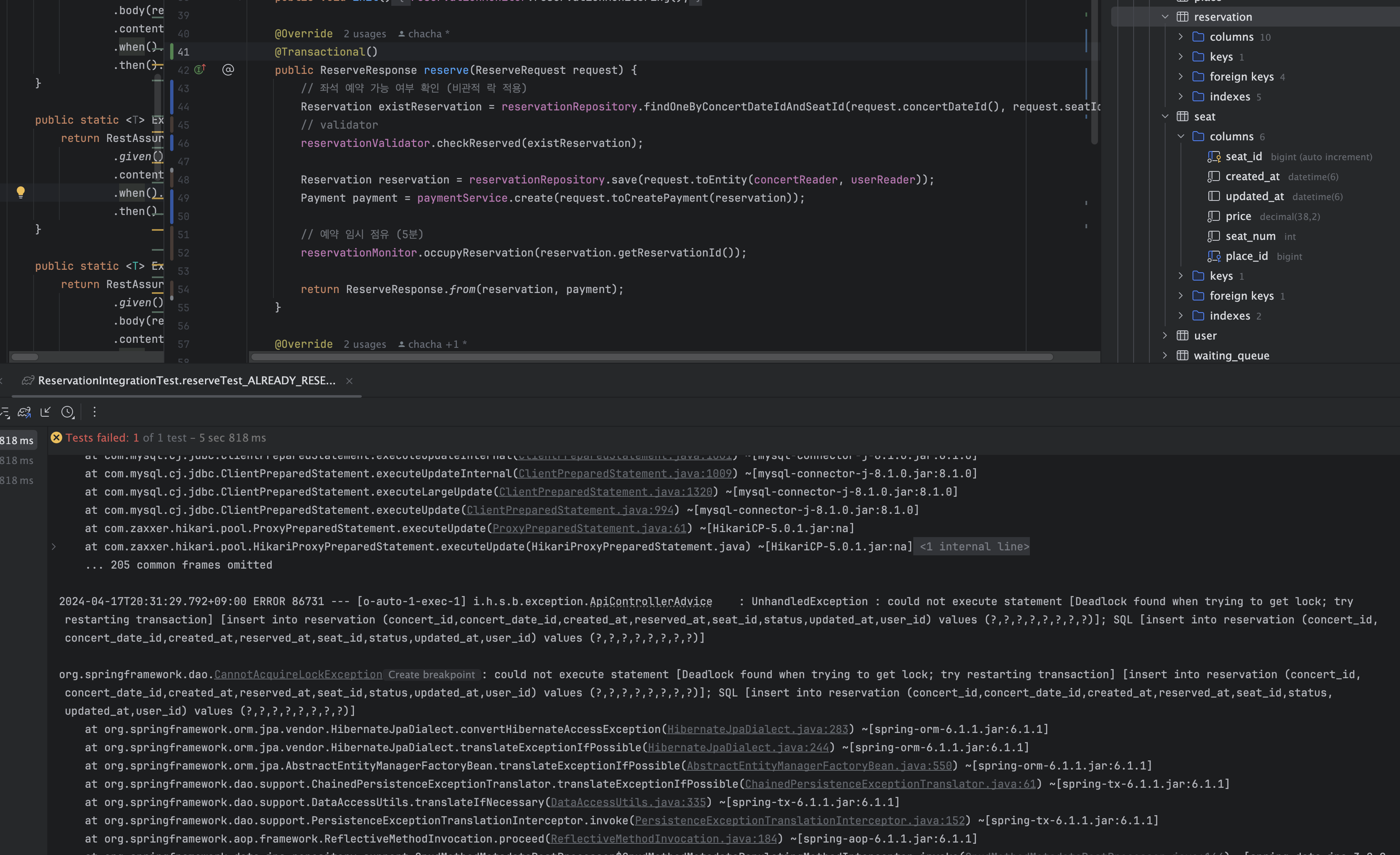 1. 문제 동시성 제어 처리 테스트 중 낙관적 락 구현, 비관적 락 구현 모두 에러 비관적 락으로 동시성 제어 테스트 중 에러