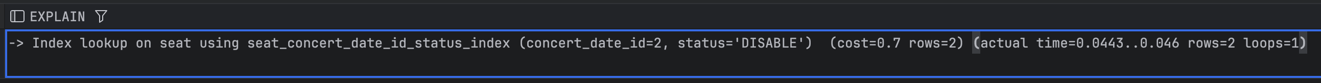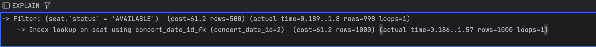 -> JOIN의 연결고리가 되는 컬럼에 인덱스를 걸면 좋다. 현재 JOIN절은 concertId, concertDateId는 PK로 자동으로 인덱스가 걸려있으며, Seat 테이블의 (concertDatdId, seatNum) 역시 유니크 인덱스를 이미 걸기로 하였다.