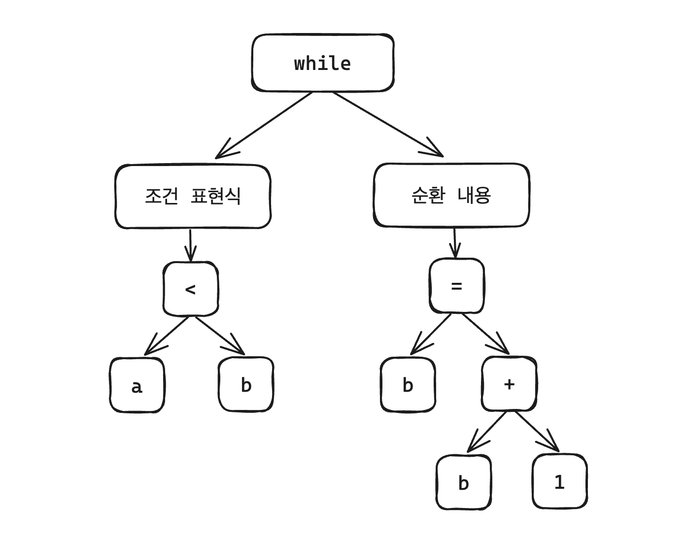 컴파일러는 구문에 따라 이 토큰들을 처리하는데, 컴파일러가 while 키워드의 토큰을 찾으면 그에 필요한 토큰이 다음에 오는지(throw syntax error), 이어서 )을 거쳐 {, } 를 처리할 때까지 계속 그 과정을 반복한다.