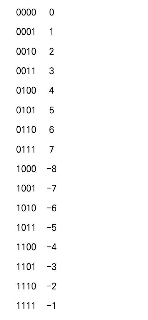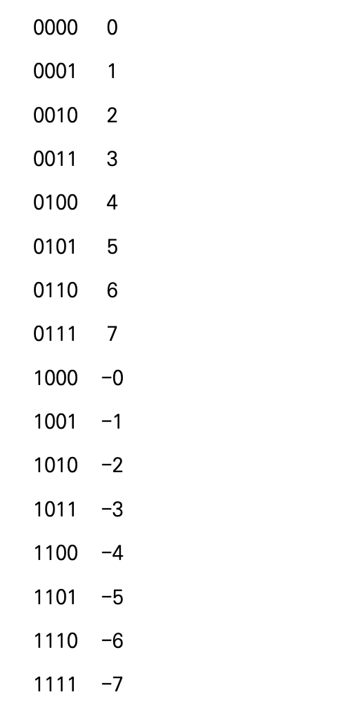 만약 4비트로 수를 표현한다고 가정하면 16개의 수를 표현할 수 있는데, 절반은 1 ~ 7, 나머지 절반은 -1 ~ -7에 나누어주어야 한다.