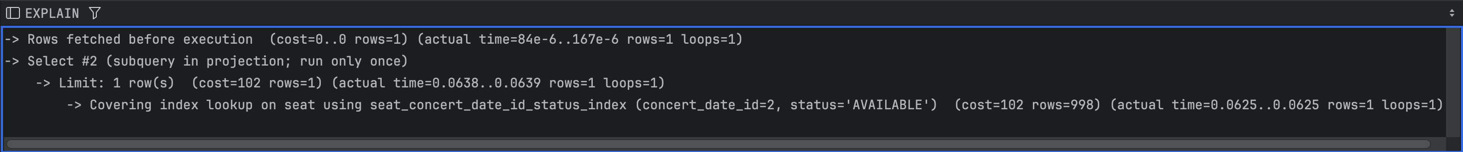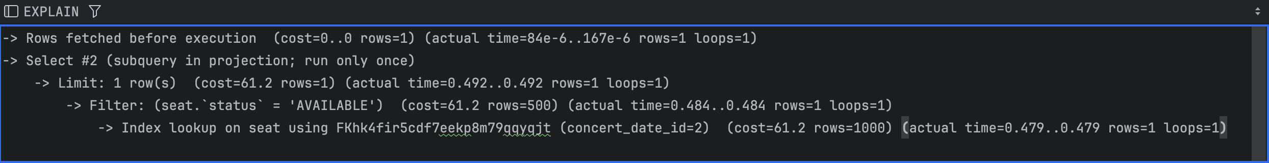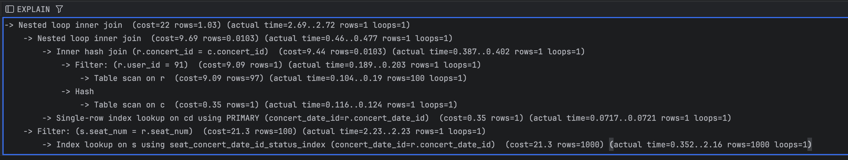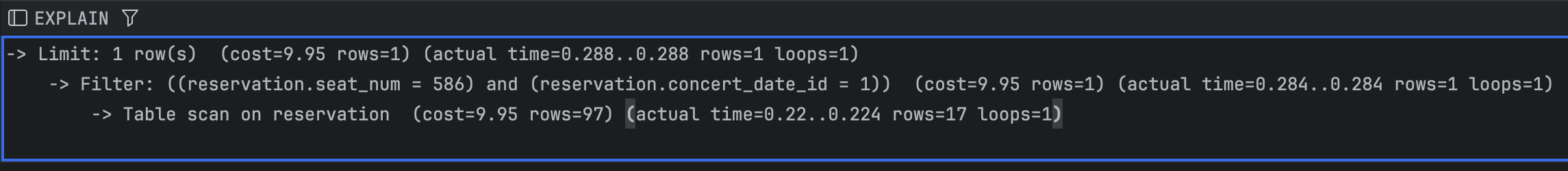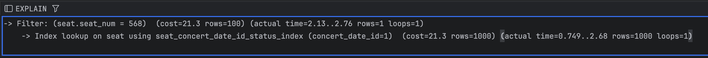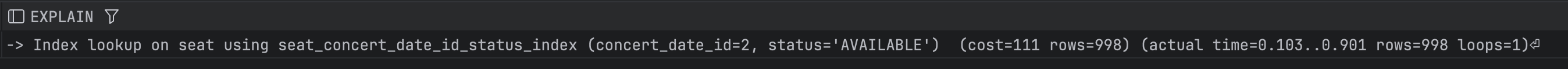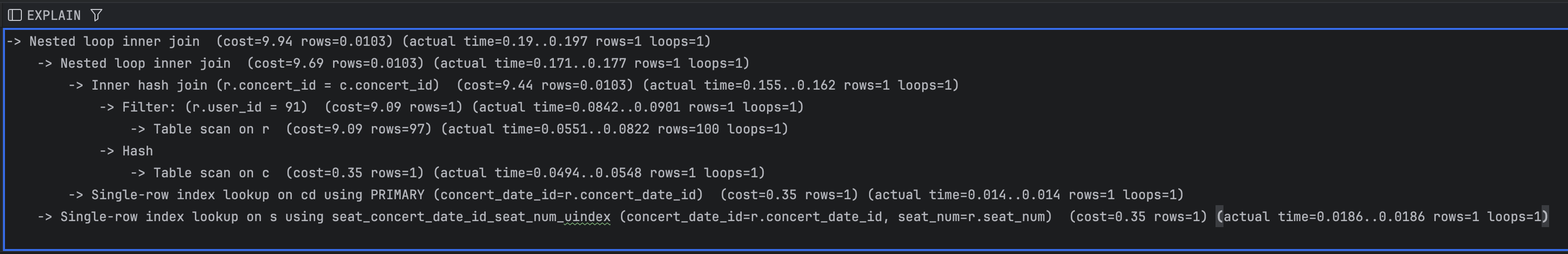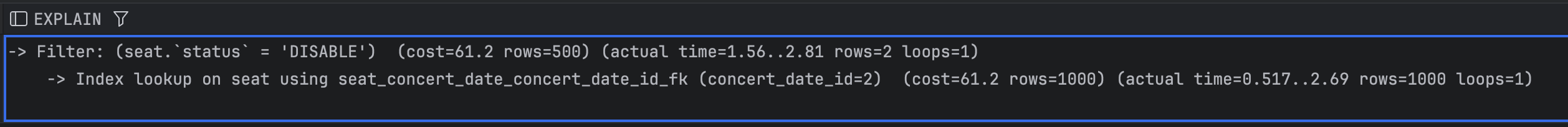 -> JOIN의 연결고리가 되는 컬럼에 인덱스를 걸면 좋다. 현재 JOIN절은 concertId, concertDateId는 PK로 자동으로 인덱스가 걸려있으며, Seat 테이블의 (concertDatdId, seatNum) 역시 유니크 인덱스를 이미 걸기로 하였다.