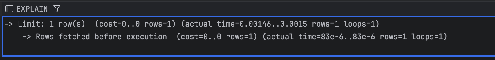 다음 쿼리는 유니크 인덱스를 추가 후 비교해보았고, 유니크 인덱스로 성능이 드라마틱하게 향상되는 결과를 볼 수 있다.