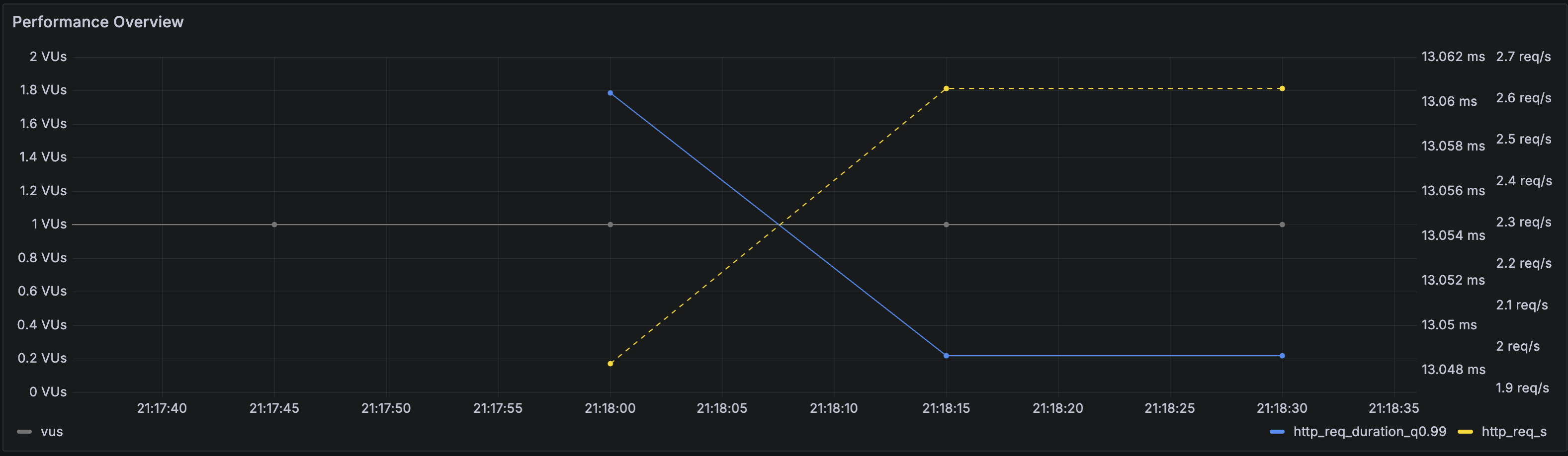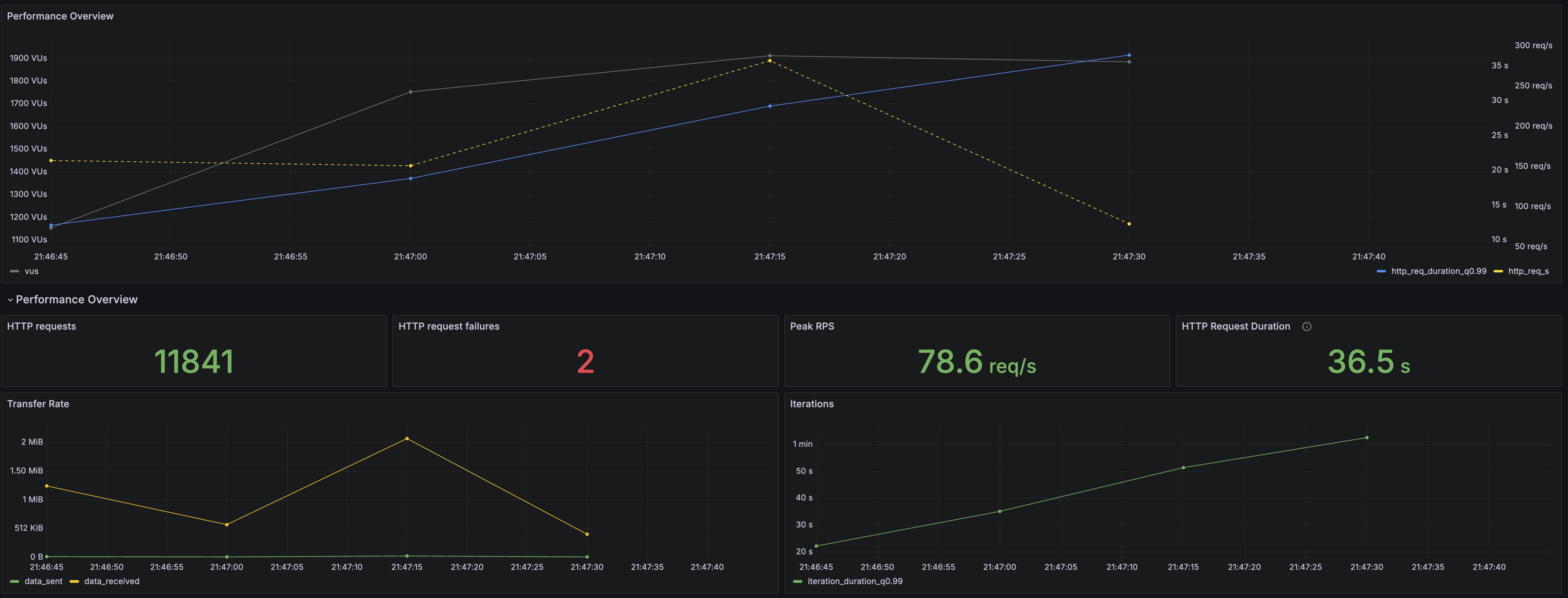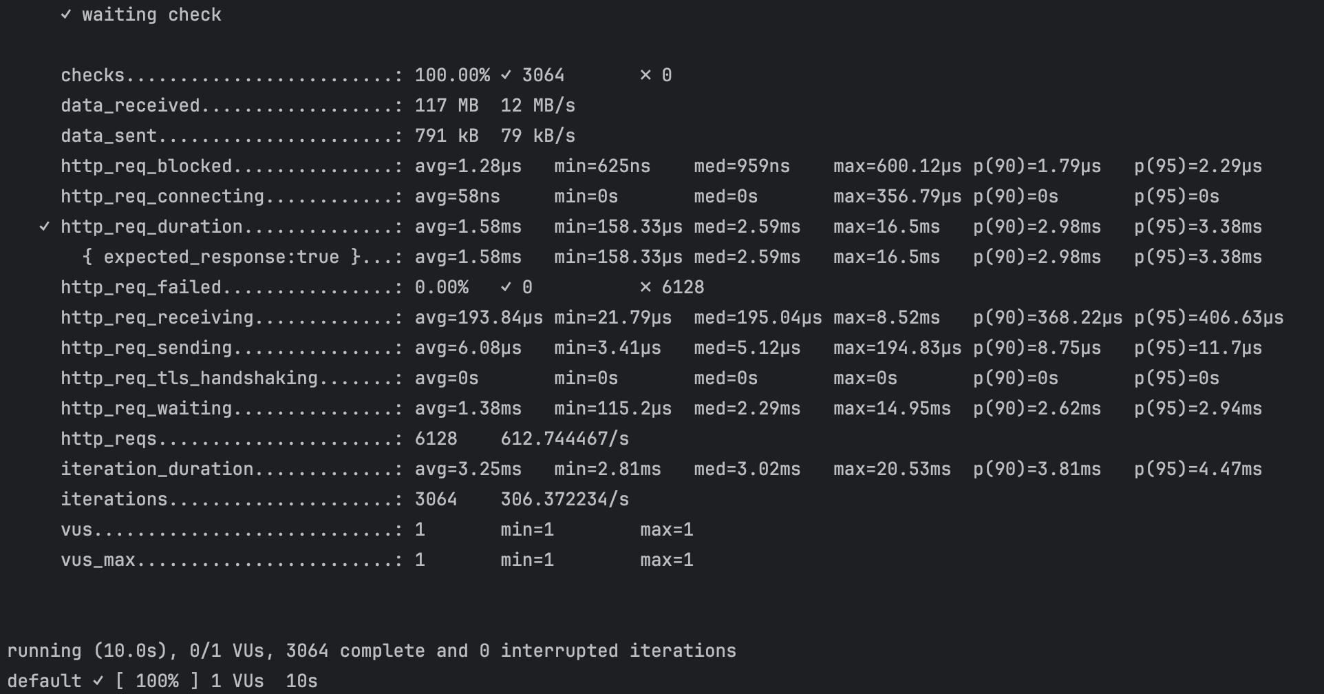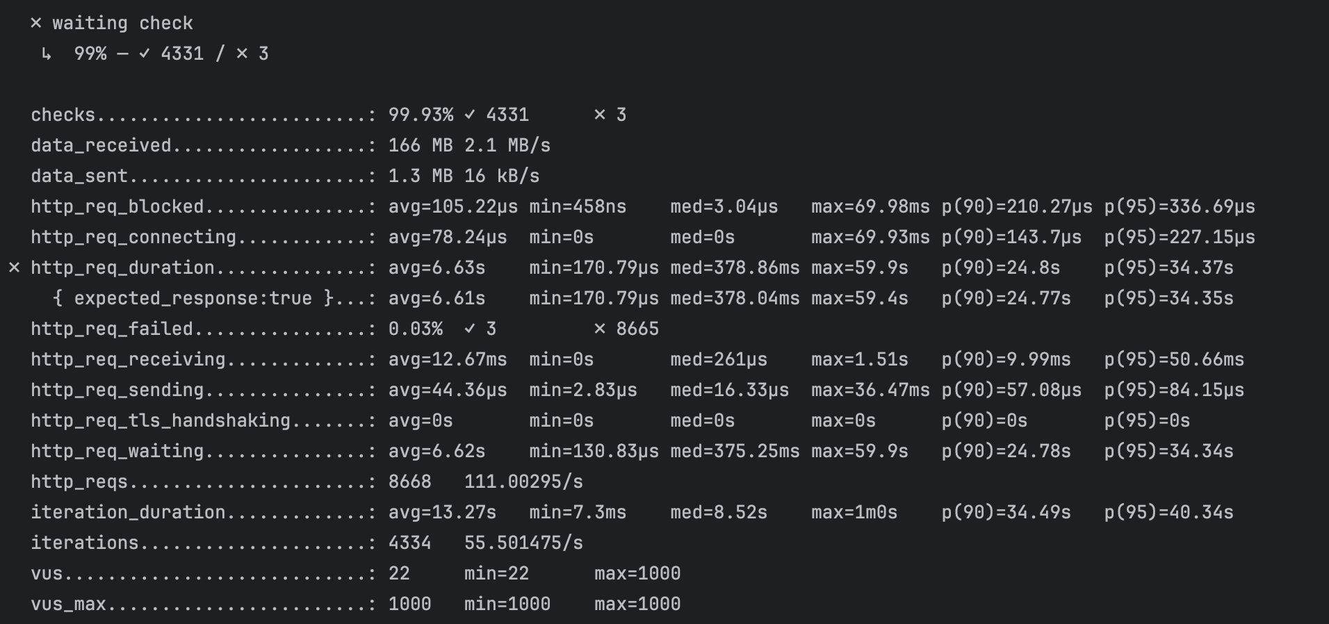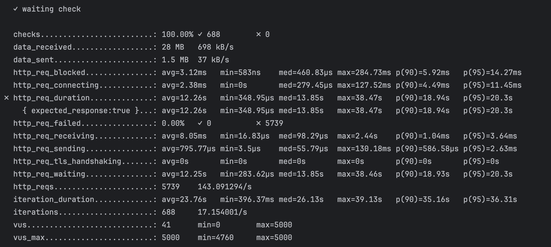 P99 를 500ms 로 잡아놓고 테스트하였는데, k6 부하테스트를 로컬에서 돌려본 결과로는 목표 VUser 값 내에서는 다 통과하였다.