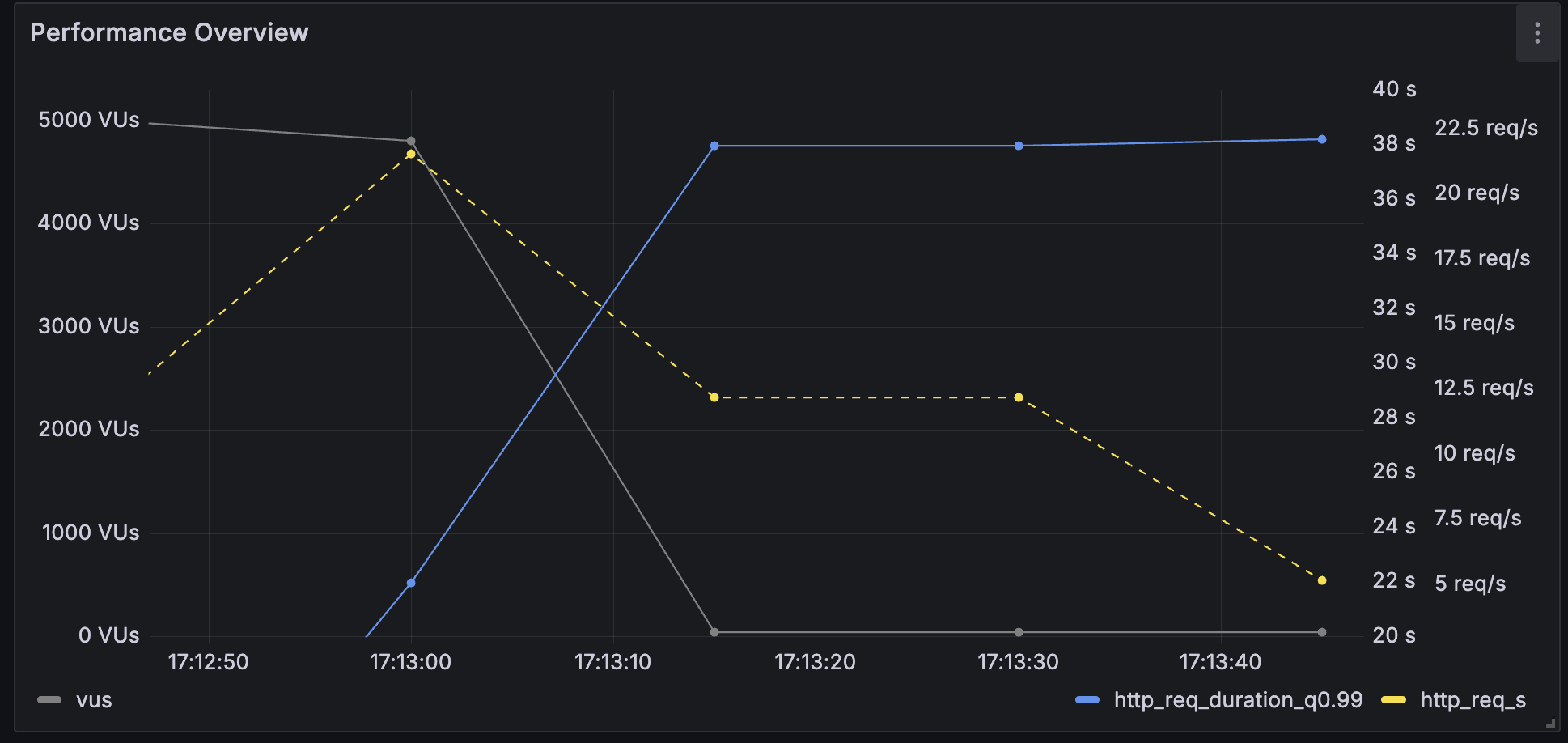 가상 사용자 수를 55초에 걸쳐 10000명으로 늘리니까 4000개의 요청을 못 하고 끝남