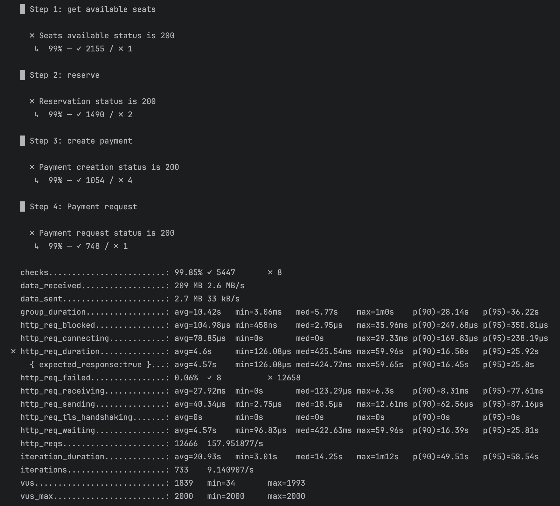 * 시나리오 전제 조건 : 콘서트 1개, 콘서트 회차 3개, 회차 당 좌석 1000개, 현재 생성되어 있는 예약 98개