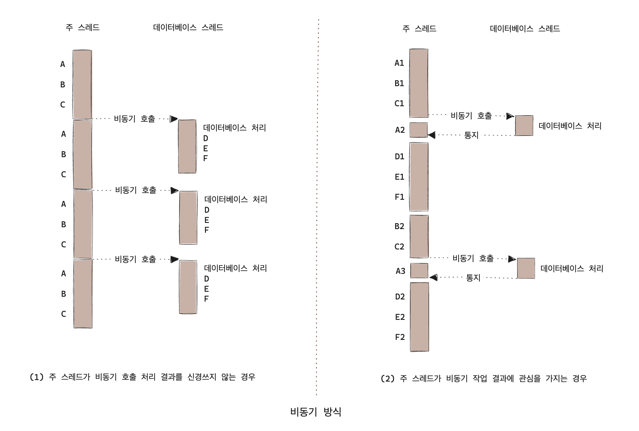 일반적으로 많이 호출되는 웹 서비스 데이터베이스 요청 처리를 동기, 비동기로 각각 처리하면 다음과 같을 것이다.