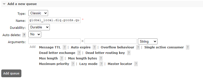 만약, 수동으로 RabbitMQ 콘솔에서 DLX, DLQ를 생성하고 Work Queue에 DLQ를 설정하고 싶다면
