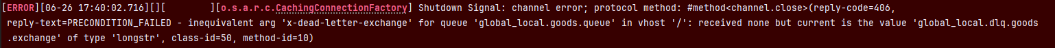 ⚠️ 자동 생성 시 x-dead-letter-exchange , x-dead-letter-routing-key arguments가 설정이 되지 않았거나, RabbitMQ 콘솔에 동일한 이름의 arguments 설정이 다른 Queue가 존재할 경우 PRECONDITION_FAILED 에러 발생