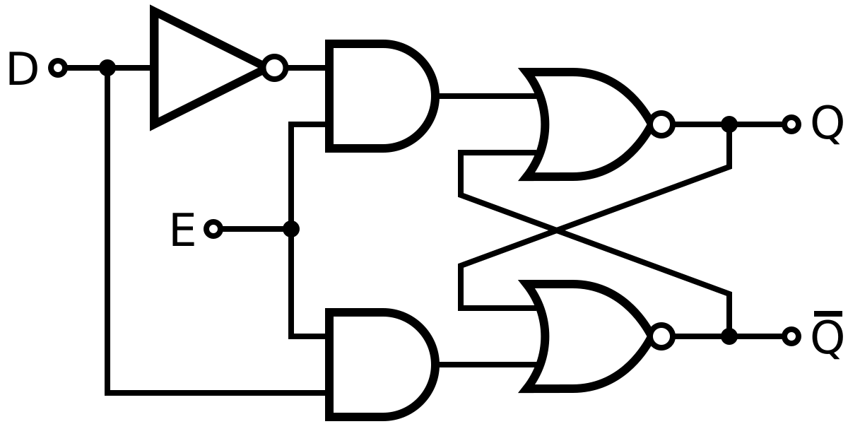 실제로 저장하는 데 필요한 입력은 비트 하나이며, D 단자에 따라 회로의 저장값이 달라진다. E(Enable)단자는 저장 여부를 선택하는 데 사용된다. D 단자가 0이면 전체 회로가 저장하는 것은 0이며, 그렇지 않으면 1이 된다.