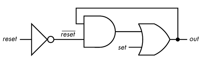 가장 보편적으로, 두 개의 부정 논리곱 게이트(non-conjunction gate)의 조합으로 "정보를 기억하는 회로"를 만들 수 있다.