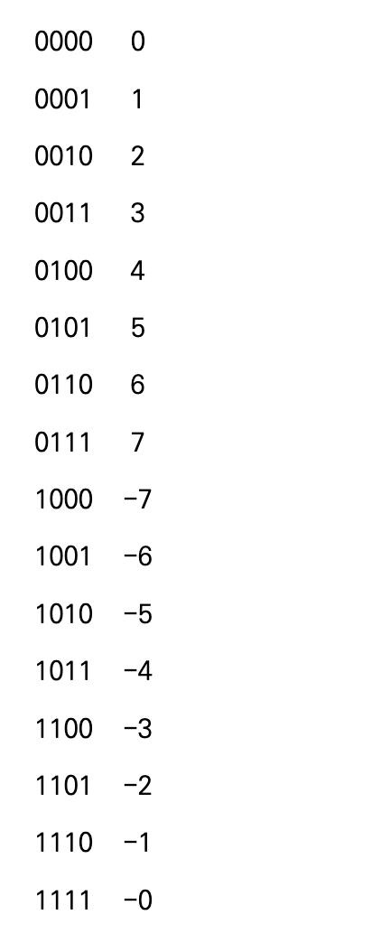 만약 4비트로 수를 표현한다고 가정하면 16개의 수를 표현할 수 있는데, 절반은 1 ~ 7, 나머지 절반은 -1 ~ -7에 나누어주어야 한다.